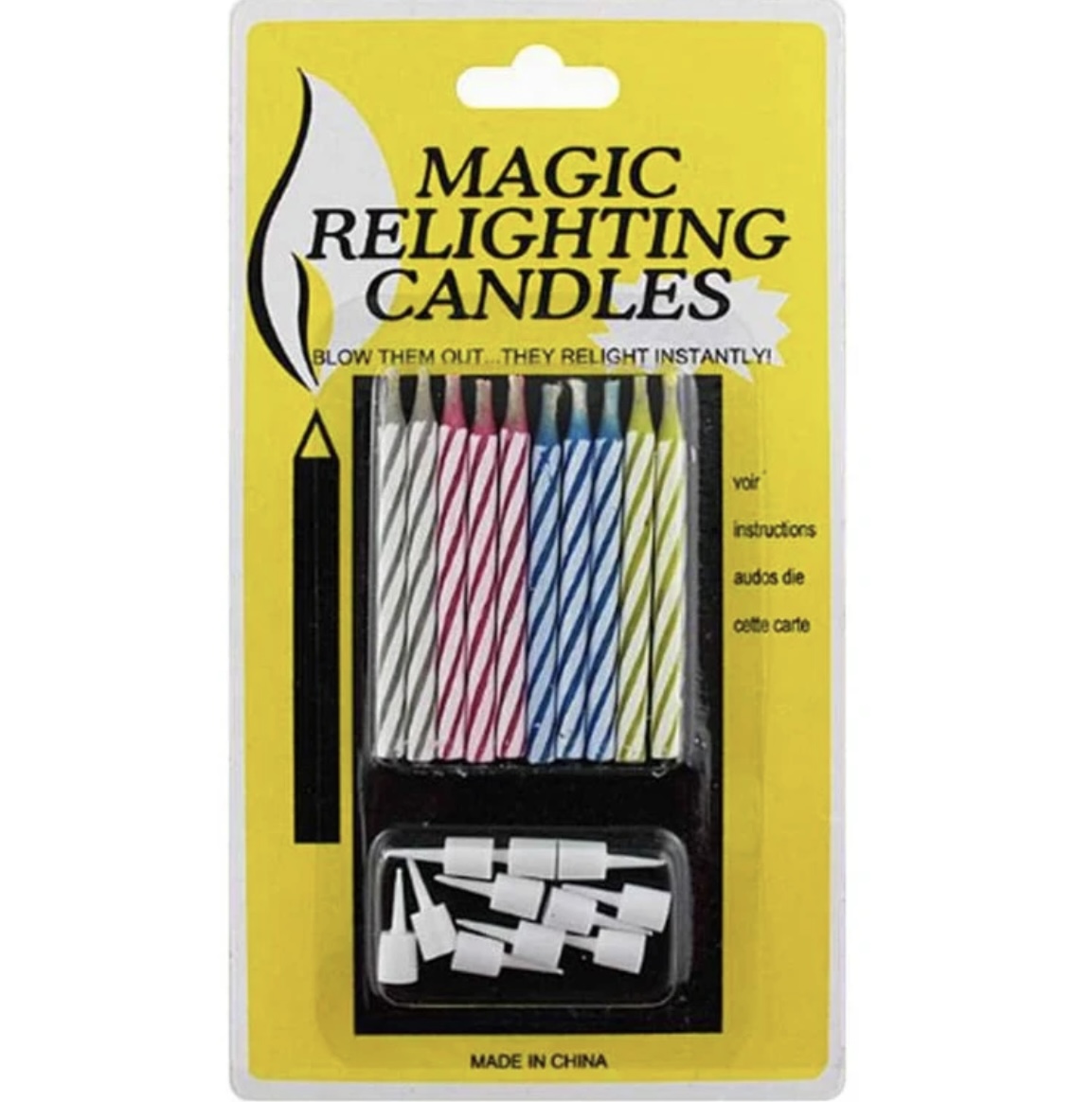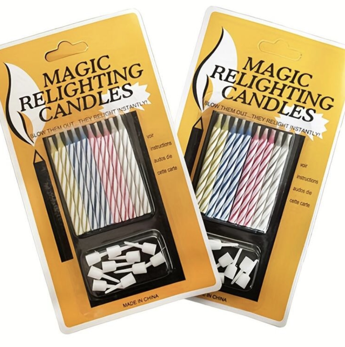 A csomag 10 db vegyes színű újragyulladó gyertyát tartalmaz talpakkal.