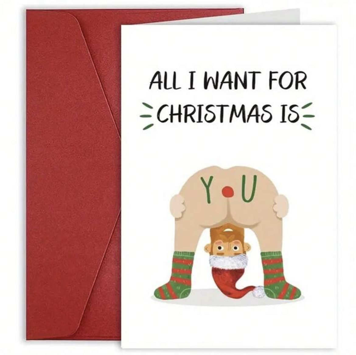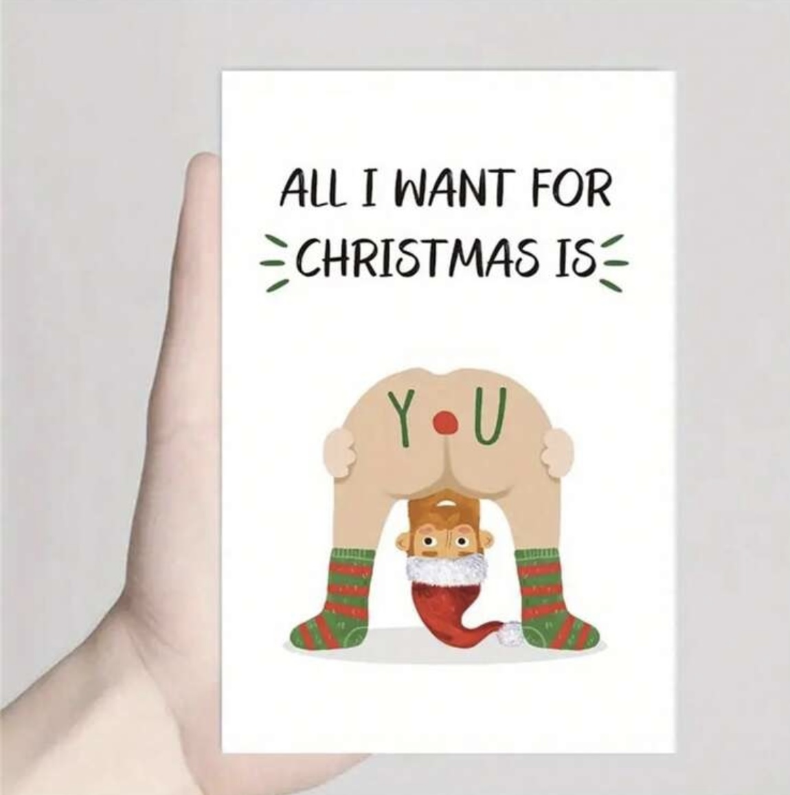 Csak téged akarlak karácsonyra – feliratú vicces képeslap, mellyel feldobhatod az ünnepet, bárkinek is küldöd.